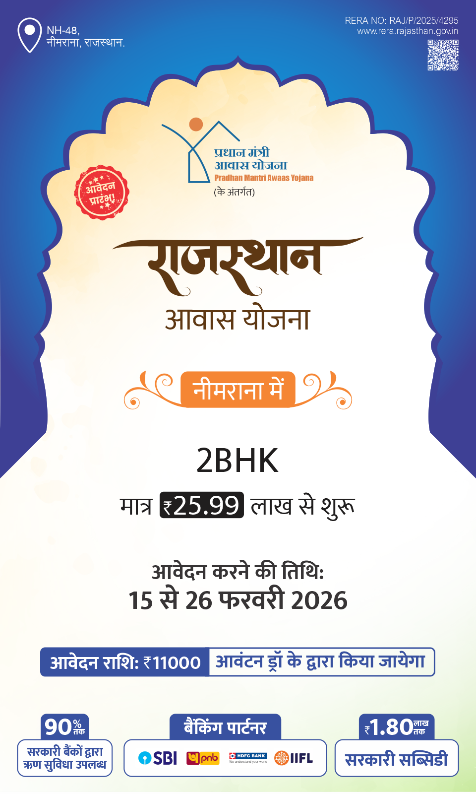 'प्रधानमंत्री आवास योजना के अंतर्गत नीमराना में फ्लैट्स के लिए ड्रा द्वारा आवंटन, आवेदन आमंत्रित हैं'।