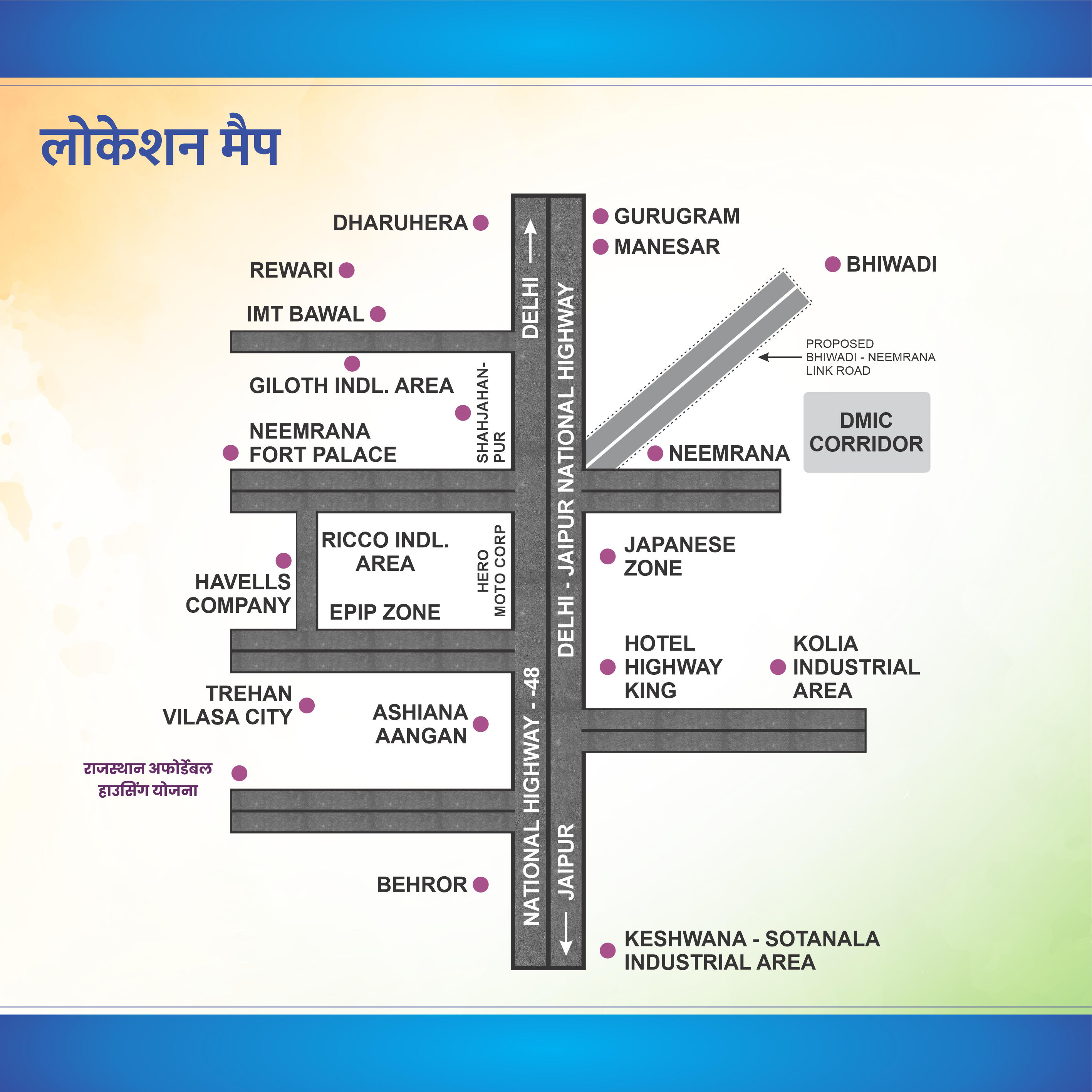 इसी भावना के साथ त्रेहान लाया है 2 BHK वर्ग के लिए अपने उम्मीदों का घर पाने का मौका. मुख्यमंत्री जन आवास योजना के तहत त्रेहान अपना घर प्राइवेट लिमिटेड के राजस्थान राज्य सरकार के साथ अनुबंध के तहत 2 BHK वर्ग के फ़्लैट्स नीमराना (दिल्ली, एनसीआर) में 60 मीटर चौड़ी जयपुर दिल्ली रोड पर बनाए जा रहे हैं. इस आवासीय परियोजना में 250 फ़्लैट्स हैं
