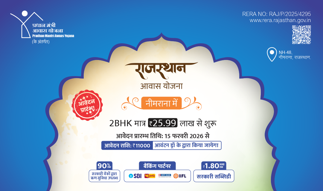 'प्रधानमंत्री आवास योजना के अंतर्गत नीमराना में फ्लैट्स के लिए ड्रा द्वारा आवंटन, आवेदन आमंत्रित हैं'।